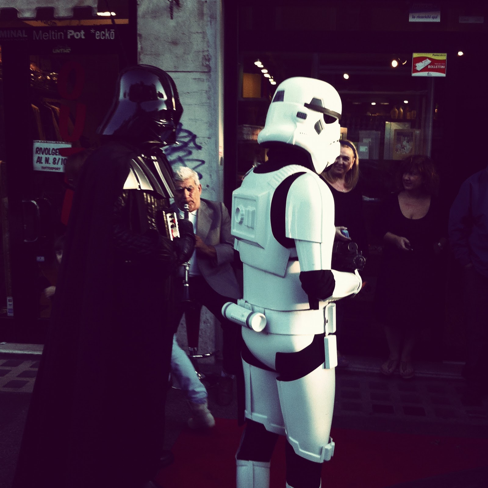 Credo che per tutti i miei lettori del mio blog sia chiaro che detti energumeni in realtà fossero le rappresentazioni reali di un paio di Star Troopers e di nostro signore oscuro dei Sith, Darth Vader (o Fener, come la vecchia trilogia di Guerre Stellari insegna). Che ci facevano a Roma invece che sulle lune di Tatooine? Presto detto, nel week end è stata inaugurata, per la mia gioia geek e cinefila, una mostra/esibizione dedicata al mondo di Star Wars presso il Tempio del Cinema di Roma.